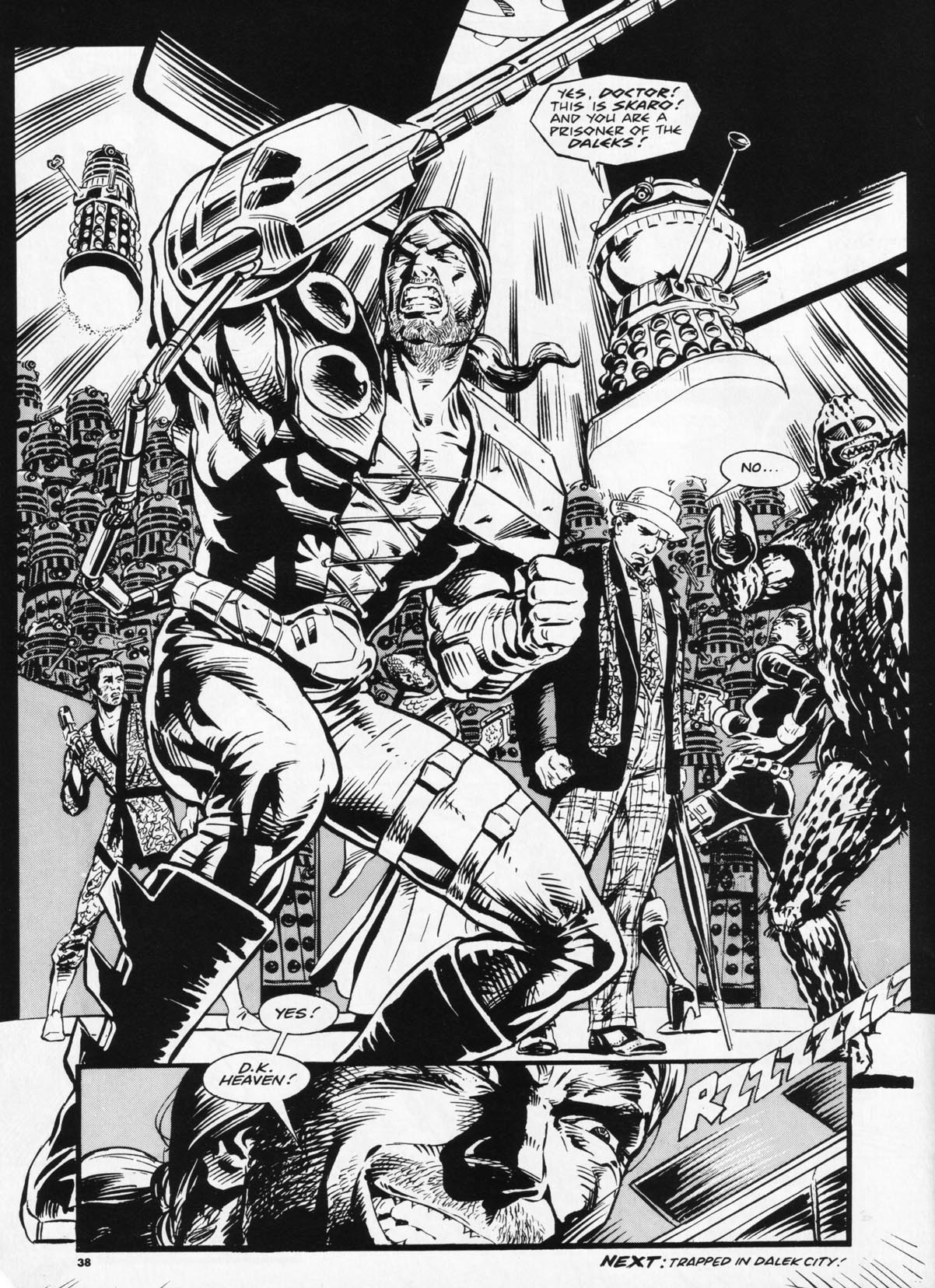 A bit of a Dalek theme has run through my time with the Doctor, as you may have noticed . . . here's a page from 'Emperor of the Daleks' which resurrected Dalek-Killer Abslom Daak in DWM (we bumped this long-time comic strip character off in a previous strip). This seventh Doctor story - written by a certain Paul Cornell - gave me an opportunity to reuse my Emperor Dalek design which was an amalgam of the TV21 Golden Emperor and the TV story 'Remembrance of the Daleks' Davros/Emperor; itself a tip of the hat to the original Dalek comic strips.