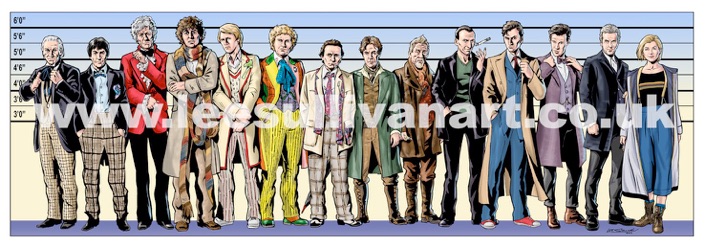 This piece has taken on a life of its own. It's based on the poster for the film of the same name which is in turn based upon the line spoken by Claude Rains in Casablanca: 'Round up the usual suspects.' Originally created to illustrate an article for DWM in 1999, only the first seven Doctors featured. I added others including Peter Cushing, Rowan Atkinson and the Richart E Grant Scream of the Shalka versions gradually for its new owner until I ran out of background, at which point I cut and stripped out the figures and pasted them into a new, longer background. For real, not digitally!